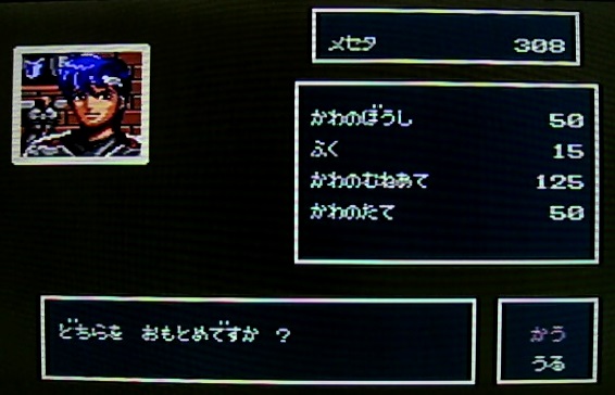 少し迷いましたが、かわのむねあてとかわのぼうしを購入し装備させます。前作であるファンタシースターⅡでは両手持ちの武器があったため、かわのたては敬遠してしまいました。