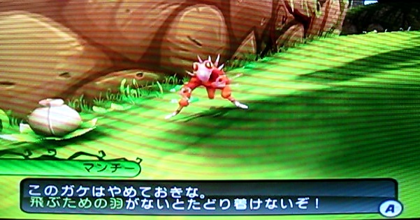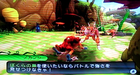 レッドメテオから助けたノカンシーというクリーチャーに話しかけると、バトルに勝ったら巣を使わせてくれると言ってくれます。
