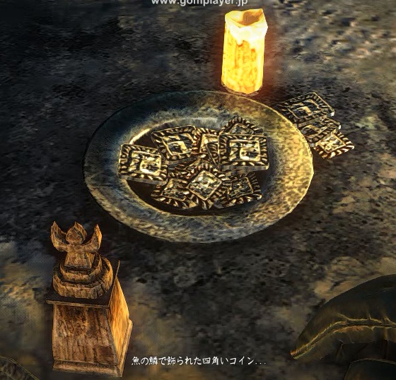 蝋燭の近くには例の四角いコインも落ちています。意味ありげな手紙も落ちているので回収しておきます。