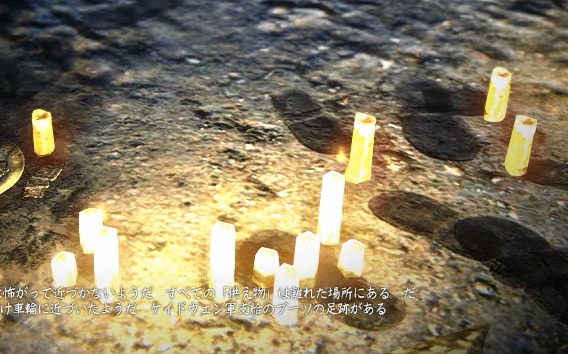 目立つのは左側の磔台と焦げた車輪、そして右側の蝋燭ですね。