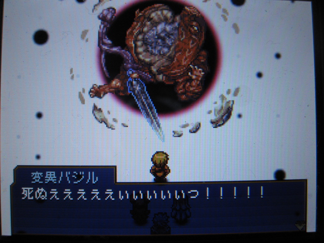 変異バジル:「…ここより先は真の闇。暗黒世界ンカイ。悪魔の起源であり故郷…母…。神も人間も踏み入れぬ領域。世界は闇より生まれ、闇に通じるのだ。こざかしい人間共よ。さぁ!この邪聖剣に恐怖し、そして悪魔に歯向かった事を後悔するがいい!」