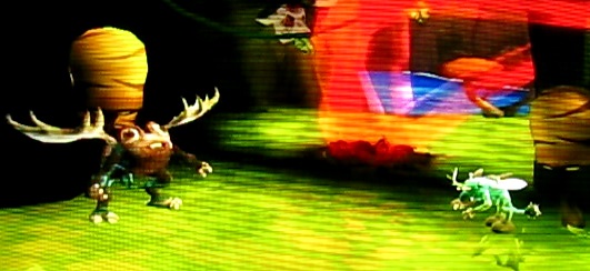 そこで出番になるのが手前にあるウ○コのような植物です。こいつをけっ飛ばすと体に虫が付着します。付着したまま道を塞ぐ植物の下へ向かえばOKというわけです。