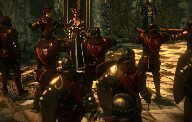 ヘンセルト:「その通りだ、ナタリス。エムヒル・ヴァル・エムレイス皇帝の軍隊を阻止すべてきテメリア国が今や分裂し弱体化している。だが、テメリアの地には法と秩序が必要だ。フォルテストの寛容さに甘え増長した貴族領土たちにその力はない。テメリアの幼君をめぐる抗争など我がケイドウェンにはどうでもいい。大事なことは、貴国には数多くの重要な貿易路が通っているということだ」