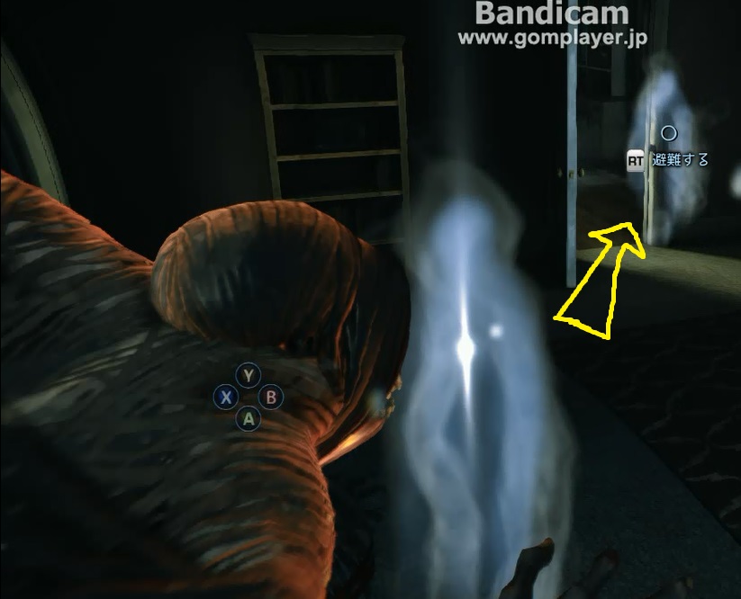 画面右側にある魂の残余(右側の白いモヤモヤ)に向かってRボタンを押すことで隠れることができます。魂の残余は避難オブジェクトというわけですね。