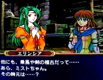 エリンシアも倉庫へ行き、ミストとヨファの手伝いをします。そこで彼女はミストのつけている胸元のメダリオンに興味を持ちます。