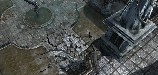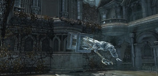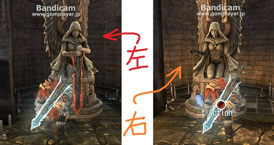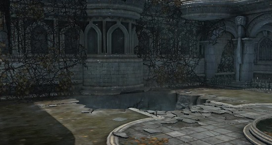 ここから中庭のカットムービーで出てきた石像のところへと行けるようになります。石像の前にきたら下に蹴り落とします。