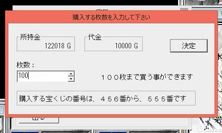宝くじは1枚100G。好きな3桁の数字を指定して連番で100枚まで購入する事ができます。3桁全て当たれば1等、2桁当たれば2等、1桁で3等当選となります。
