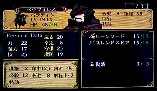 ただユニットとしては飛行ユニットで唯一回復の杖が使えるという特長があるので、それを後列でいかしてもらうというなら生きる道はあるのかもしれないです。ただ、その場合も弓の攻撃範囲に注意する必要があるのですが。