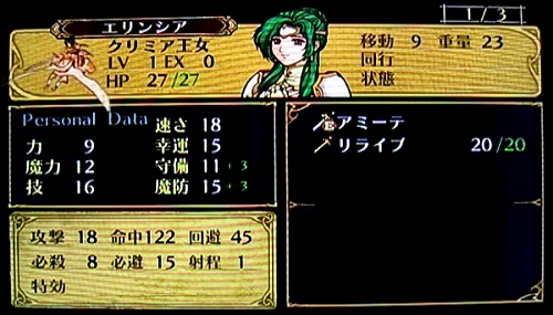 レベル1である事を考えるとステータスは高めといえるのですが、いかんせんもうゲームも終盤。いくらアミーテという強力な専用武器があったとしても今更前衛として育てるのはしんどいです。空飛ぶ回復ユニットとして割り切るのがよさげですね。