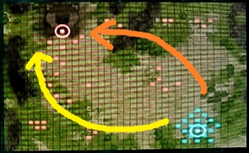 大雑把に自軍を2つに分け、オレンジの方がマップ上部の残党を蹴散らし、黄色の方がマップ左方の残党を蹴散らすという形で攻め込みます。