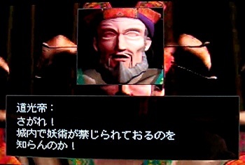 道光帝:「騒ぎを起こしていたのはお前か。さがれ!城内で妖術が禁じられておるのを知らんのか!さがれ!今は旅人風情の相手をしている暇などない。さあ、さがれ!何者だお前は!ここになんの用がある!天道式が無事に終わるまで妖術はならん。騒ぎも起こすな。ただちに城下にさがれ!」