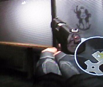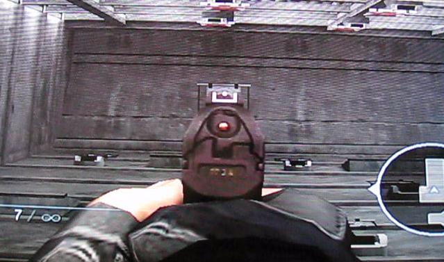 試射場で射撃訓練ができますが、Wiiリモコンの感度のせいで狙いが付けにくい…。そんな時の救済措置として、Zボタンを押したままにすると、銃のサイトで狙いがつけられるようになります。