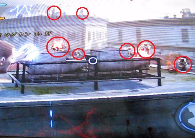 見て下さい、赤い丸が目視で確認できるミリシアの数です。容赦なくマシンガンで攻撃をしできます。おまえら、落ちつけよ…。
