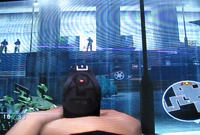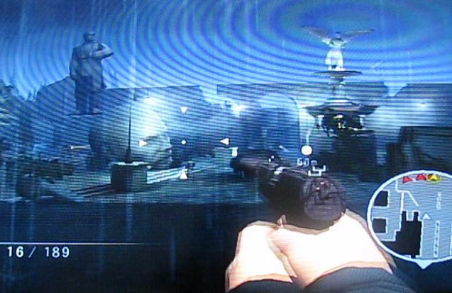 画面にうっすらと映っている紫のレーザー光線は、ボンドにあたるとグレネード弾を連発してくる物騒な兵器です。ハッキングで止めることができますが、はっきり言って脅威以外の何物でもないです。