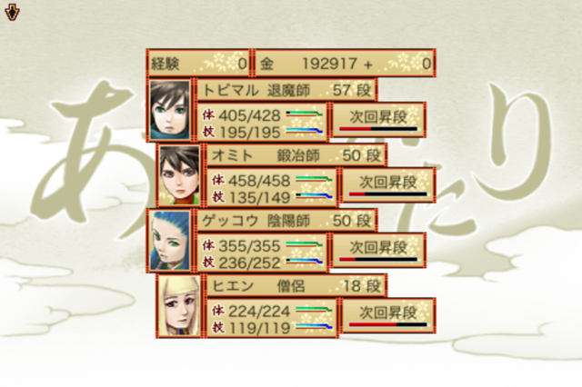 まずLv50になった遊び人であるヒエンを僧侶に転職させます。オミトとゲッコウはしばらく今の職業で進みます。