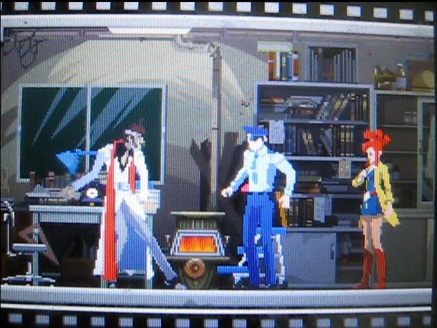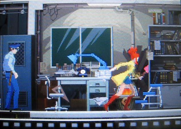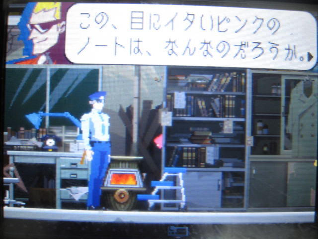 警官:「"リンネ刑事を見張るべし"…との命令で、この部屋に来たものの。こうして食い入るようにみていると、…カワイイなあ。リンネ殿。"アヤシイそぶりを見かけたらソトの刑事にデンワで報告すべし"…との命令で、この場所に立っているものの。あのウツクシサこそ、アヤシイ!…デンワしてみようかなあ。」