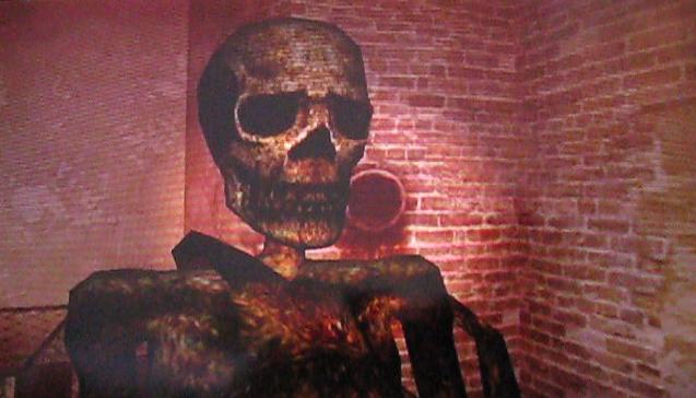 さて、このステージですが、敵がワラワラと居ます。そして、骸骨の銅像もちらほらと設置してあります。骸骨の銅像に近づくたびに画面が真っ赤に光ります。