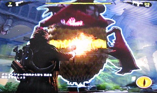 画面のとおり、体内から撃つと、クワッドジョーの弱点が露出します。そこを残りの片方の腕で射撃します。片方の腕はマシンガン等がいいと思います。