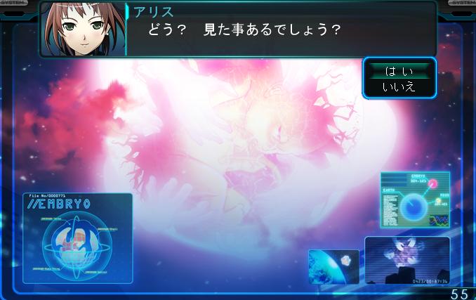 アリス:「あら、じゃあこの街に来たのはもしかして最近なの?こんな世界中を騒がせた事件に、見覚えがないなんて……。ある夜、突然空に現れたこいつのコードネームはエンブリオ。今は高次空間上に退避してて、こちらから見ることはできない。けど、まだ私たちのすぐ近くにいる」