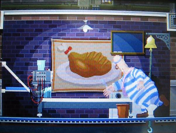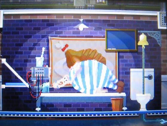 彼はいきなりトイレを破壊して奥にある穴に隠れてしまいます。しかし、右上にあるベルを鳴らすとなぜか戻ってきて手にしているスプーンを壁に投げつけます。