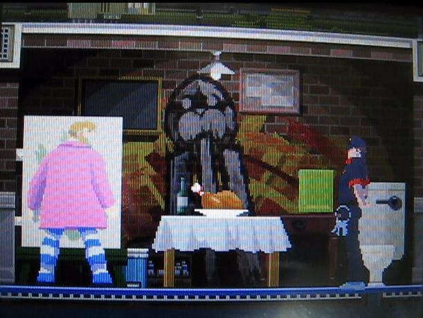 シセル:「新聞の記事を切り抜いて、フレームに入れて飾ってある。どれどれ。読んでみようか。…(…今夜。私は"イノチ""キオク"といろいろ落としたが…もうひとつ。私には"落としモノ"があったようだ。)読めないッ!なにか、"モジ"が書いてあるのはわかるが…なにをイミするのかマッタク、わからない!(…困った事になった…D99号の!"明日の予定"が読めないとは…!)…この、新聞記事。ハンニンらしいオトコの写真がのっているが…(やはり。この囚人にマチガイないようだ。)」