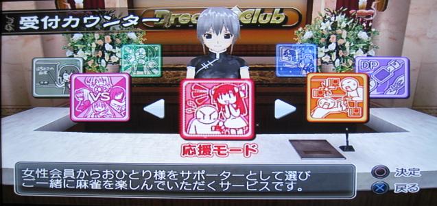 単なる対戦とは異なり。俯瞰視点でよりスピーディーに麻雀をプレイするモードです。応援モードでは対戦モードで対戦可能なキャラクターから任意のキャラクターを1人、自分のサポーター(応援キャラ)に指名できます。