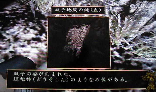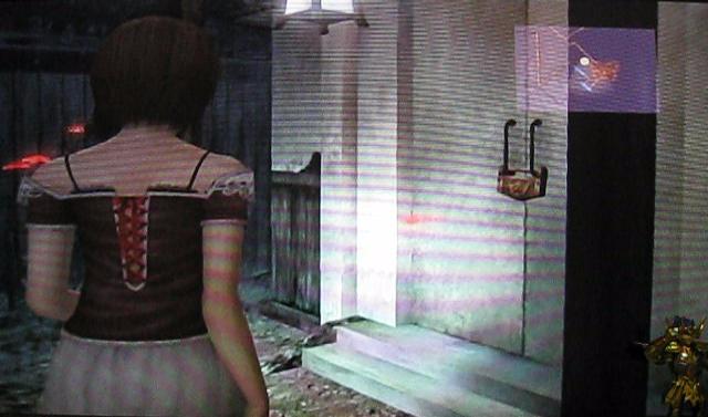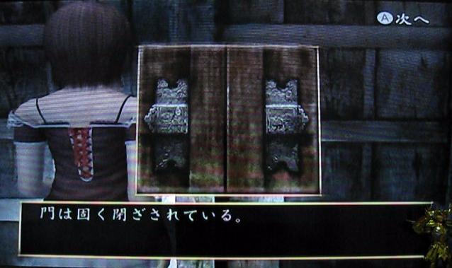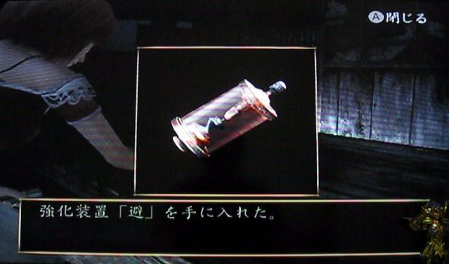 なんと、射影機の強化装置が手に入りました。怨霊に攻撃された瞬間にタイミングよくWiiリモコンを振ると、なんと攻撃が回避できるというありがたい装置です。…とはいうものの、避けるタイミングは体で覚えなければいけません…、これ、使いこなせる日は来るのだろうか…。。。