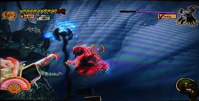 攻撃方法は下半身を倒したら、前と同じです。チアアタックからアタックコンボでビッケの体力を削っていきます。残った上半身はふわふわ浮いてダメージを与えにくいので、手が届かない場所にいる場合は、チェーンソーブラスターで射撃します。