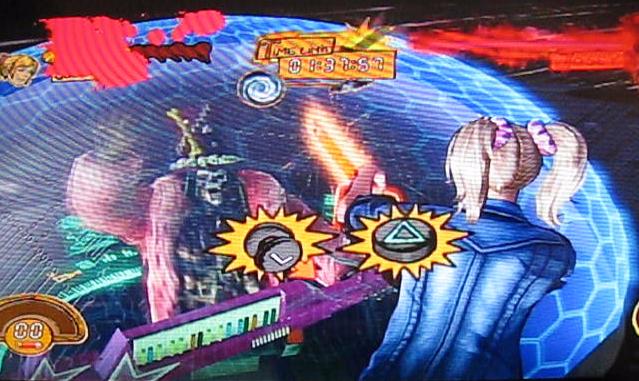 先ほどは小型のUFOでしたが、今回は超大型UFOでの戦いになります。カウントダウンと言っているように3分以内に5箇所に貼られているバリアを破壊して、ジョージィーを運転席から引きずり出す必要があります。