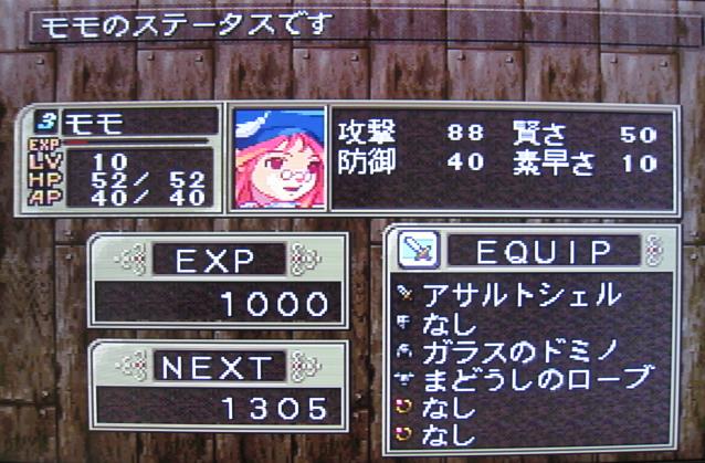 こちらが初期ステータスです。モモの特徴としては、補助魔法、回復魔法の使い手で、バズーカを装備しているため攻撃力も高めです。反面、物理攻撃ではミスが目立つため、ちょっとイラつくこともあります(笑)