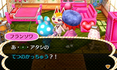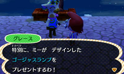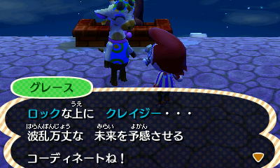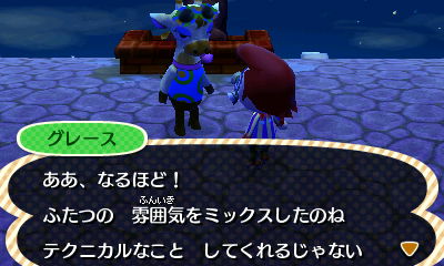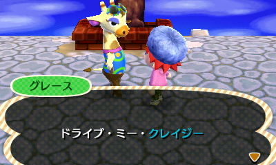 この派手なキリンは有名デザイナーらしく、この村が自分の店を出すにふさわしいかチェックしにきた模様。何回かお題に応じたファッションチェックを行い、見事合格すると村にグレースの店ができるようになります。