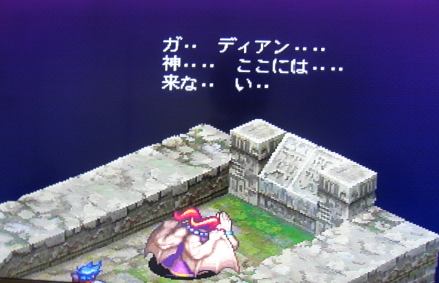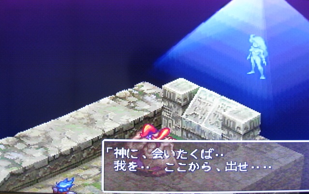 ガーランド:「大戦後…竜族を滅ぼし使命を終えた、ガーディアンは、この塔で神にいのり…勝利を捧げた。ひざまずく、ガーディアン達の目前に、神は姿を現し、身を捨て、邪悪をしりぞけた天使、一人ひとりをねぎらったと伝えられる。つまり、俺達ガーディアンはその使命の最後に、神に会う事を許されているという、わけだ…。ほとんどのガーディアンはそうやって、神と会った後、力を神にかえし、ねむりについた…。力を神に返すと我々の姿は石像と変わるのだ。…石になる前に、リュウ。お前を神に引き合わせよう。そして、問うがいい。神の、真意を…!」