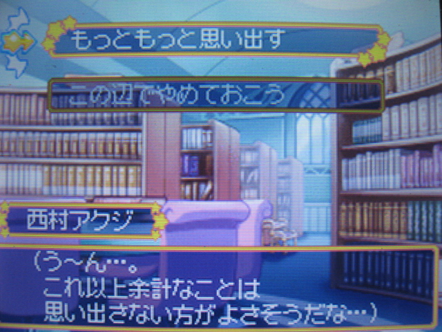 ノエル:「サノメ?知らない名前ね。もっとも、ナビ天使全員の名前なんて憶えようがないけど…。そんなことより西村アクジ?あなたに伝えておくことがあるの。心して聞きなさい。あなた以外に、天使界から魔女探しを任命された人間がいるの。ウワサでは、魔女探索人としてあなたよりずっと有望な人間らしいわ。ウカウカしていたら先に魔女を捕まえられてしまうわよ?」