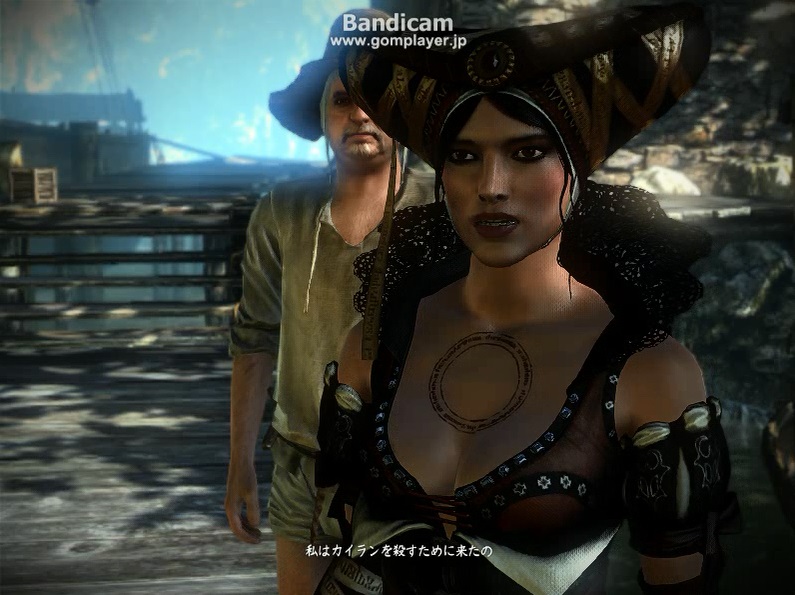 彼女の名前はシレ・ド・タンサーヴィル。独特の帽子(?)と大きく開いたセクシーな胸元が特徴です。彼女はフロットサムを恐怖に陥れている強大な怪物カイランの事を知って、討伐と魔術の素材集めのためにやってきたようです。同じ女魔術師であるトリスとは知り合いみたいですね。