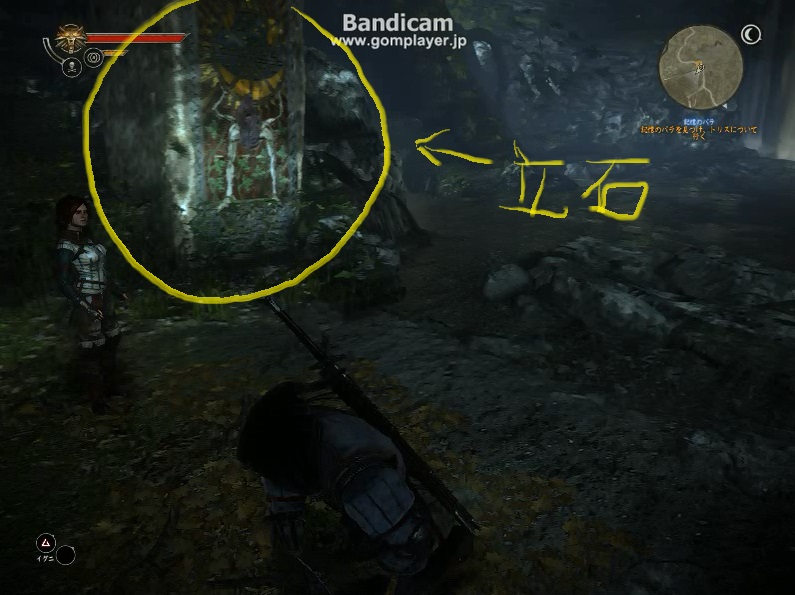 少々わかりにくいですが、黄色で囲った部分が立石です。画面右側には薄っすらですが滝が写っています。
