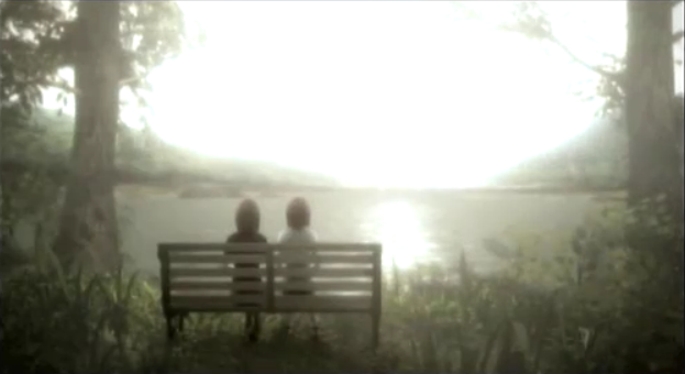 ベンチに座っている場面はおそらく村があった場所を再び訪れたのだと考えられます。しかし、そこはすでに水(ダムかなにか?)に沈んでいたという事だと思います。
