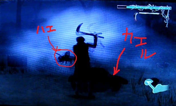 ハエは上段攻撃を振り回していれば勝手に当たって死にます。カエルは非常に厄介で接近して鎌を数回振り下ろす必要があります。途中でジャンプ攻撃をくらうのでうまくかわしましょう。
