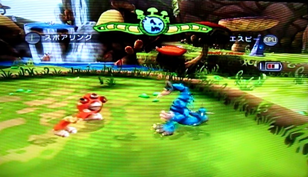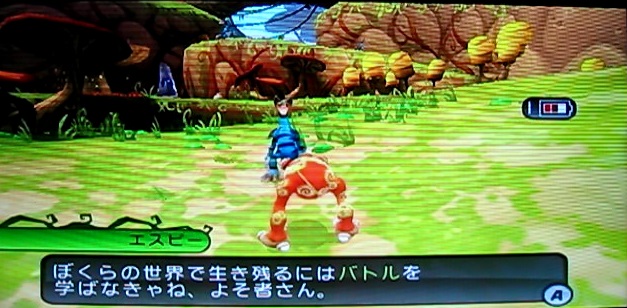 近場を探索していると、エスピーというクリーチャーにバトルを教わる事ができます。ちなみにこの世界では、バトルに勝つと他のクリーチャーから尊敬を勝ち取れるみたいです。