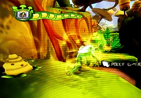 そこで出番になるのが手前にあるウ○コのような植物です。こいつをけっ飛ばすと体に虫が付着します。付着したまま道を塞ぐ植物の下へ向かえばOKというわけです。