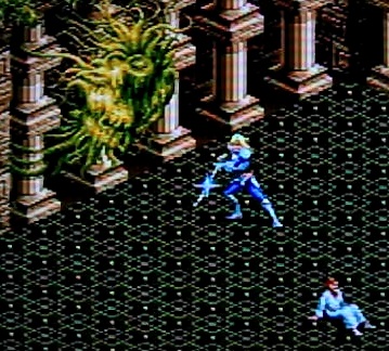 触手が元気よく右往左往するので追いかけて攻撃する必要があります。当然動き回る触手には辺り判定があるので、不用意に近づくとこちらがダメージを受けます。また、中央の顔から火の玉を吹いてきます。