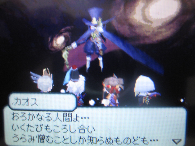 カオス:「そうか…かつて、われをたおした英雄に、たくした希望が、きさまたちに力を…!よかろう…すべての時空を闇で飲み込み無へとかえしてくれる!」