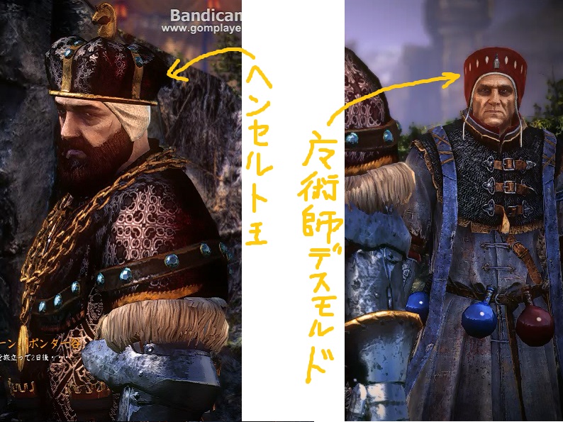ヘンセルト王(画面左)の付き人として、魔術師デスモルド(画面右)と、前章でも登場した魔術師シレ・ド・ダンサーヴィルが登場します。